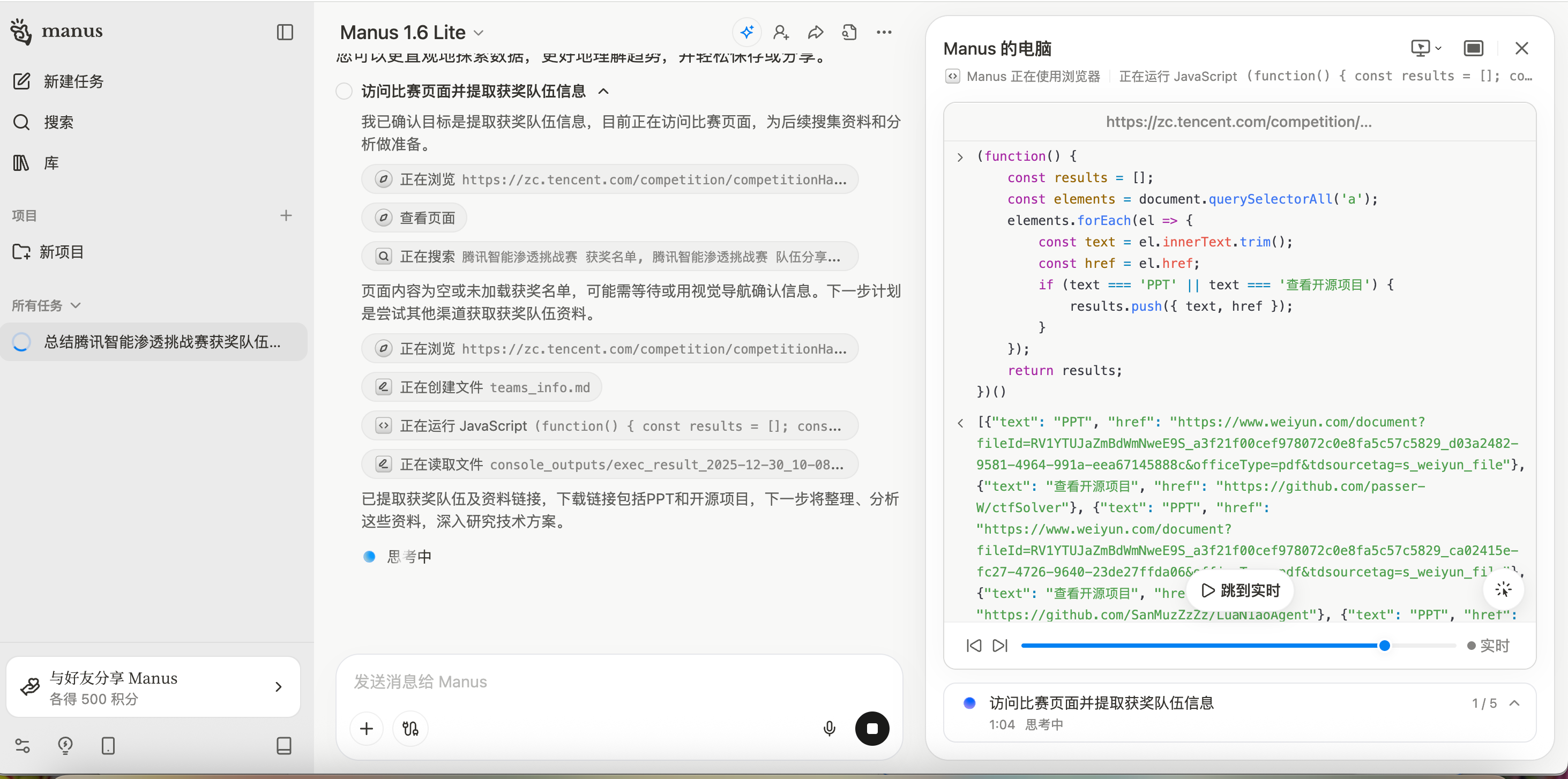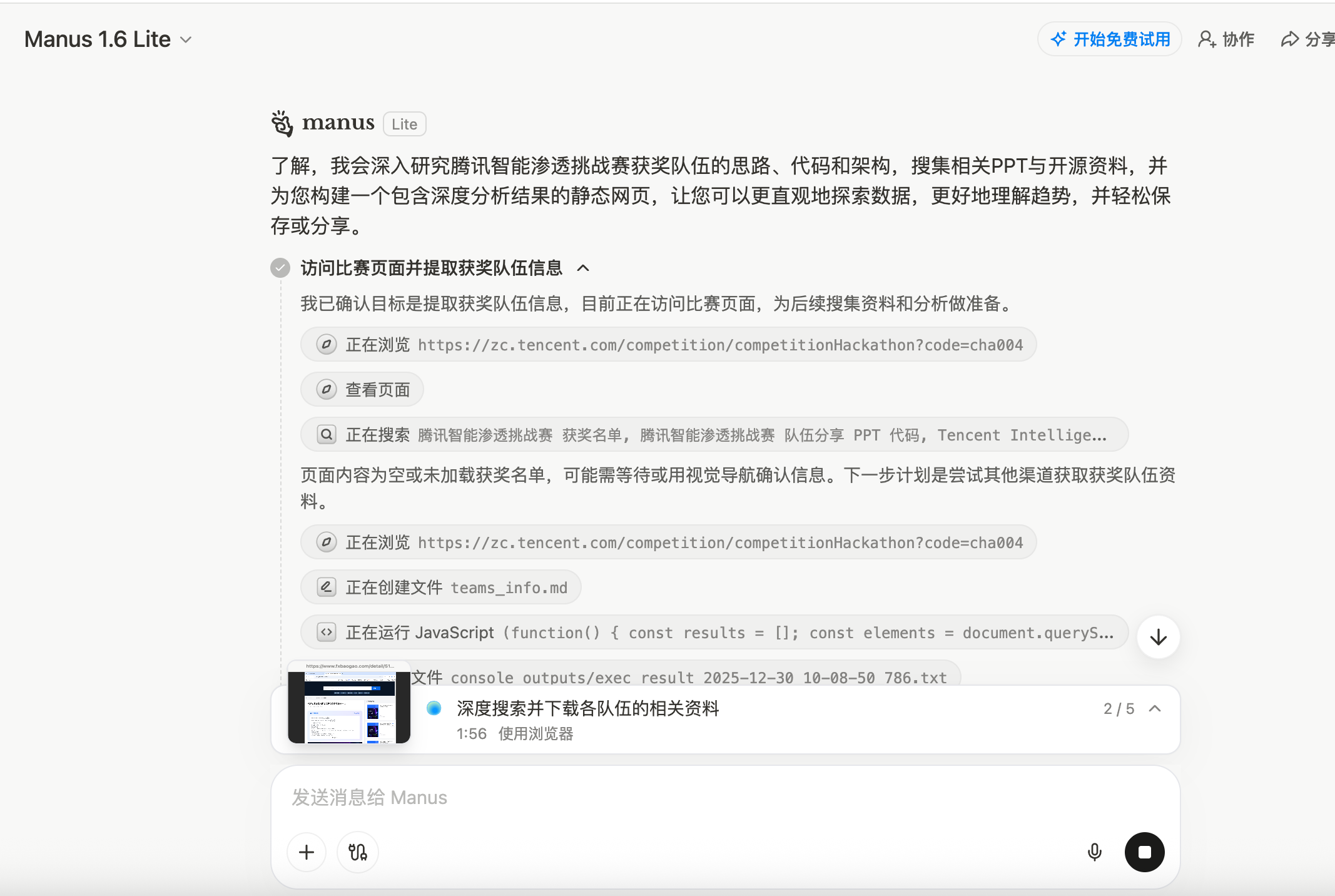 Manus提供了免费的Lite版本,发送prompt后开始执行任务。刚开始Manus的表现还算正常,它理解了我的任务意图,开始访问比赛页面收集信息,通过编写JavaScript代码来提取关键信息。