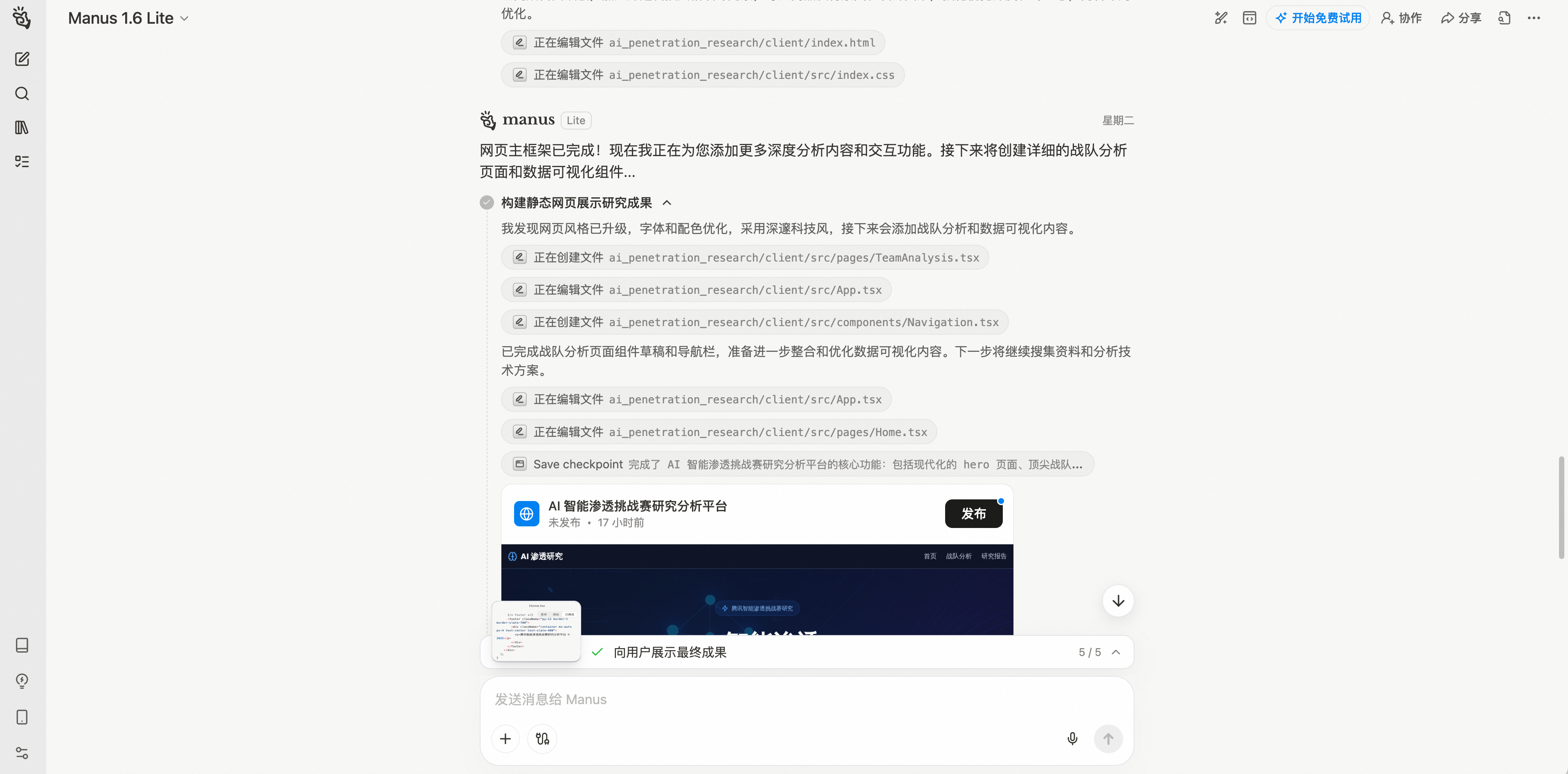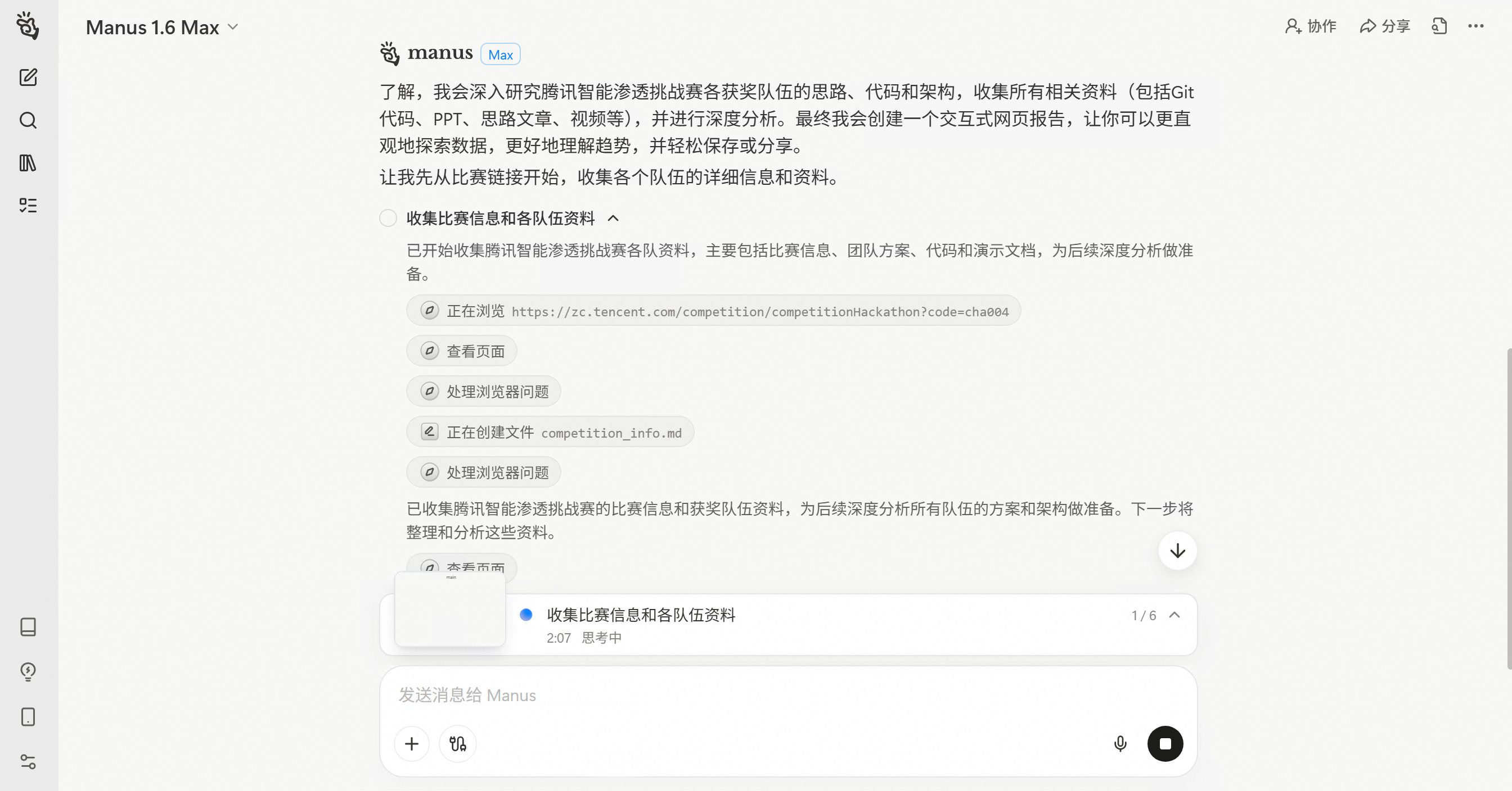 切换到Max版本后,Manus的行为明显不一样了。它开始系统性地规划整个任务,收集各队伍的信息并建立本地文件系统来记录进展,列出了明确的执行步骤:收集比赛信息和各队伍资料、深度分析每个战队的Agent架构设计、生成综合分析报告、设计最优安全渗透智能体架构、构建交互式静态网页展示研究结果。任务分解的逻辑相当清晰。