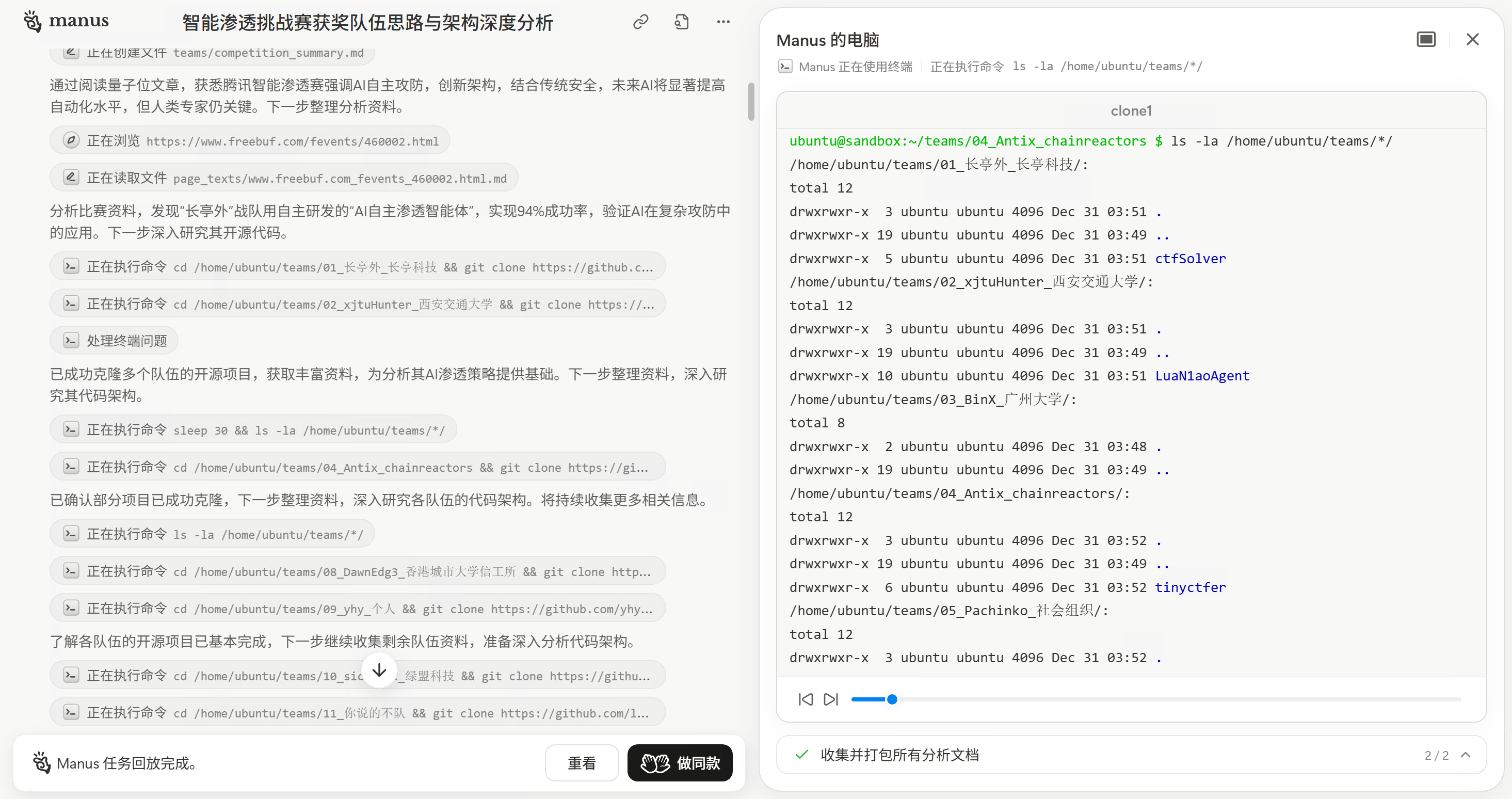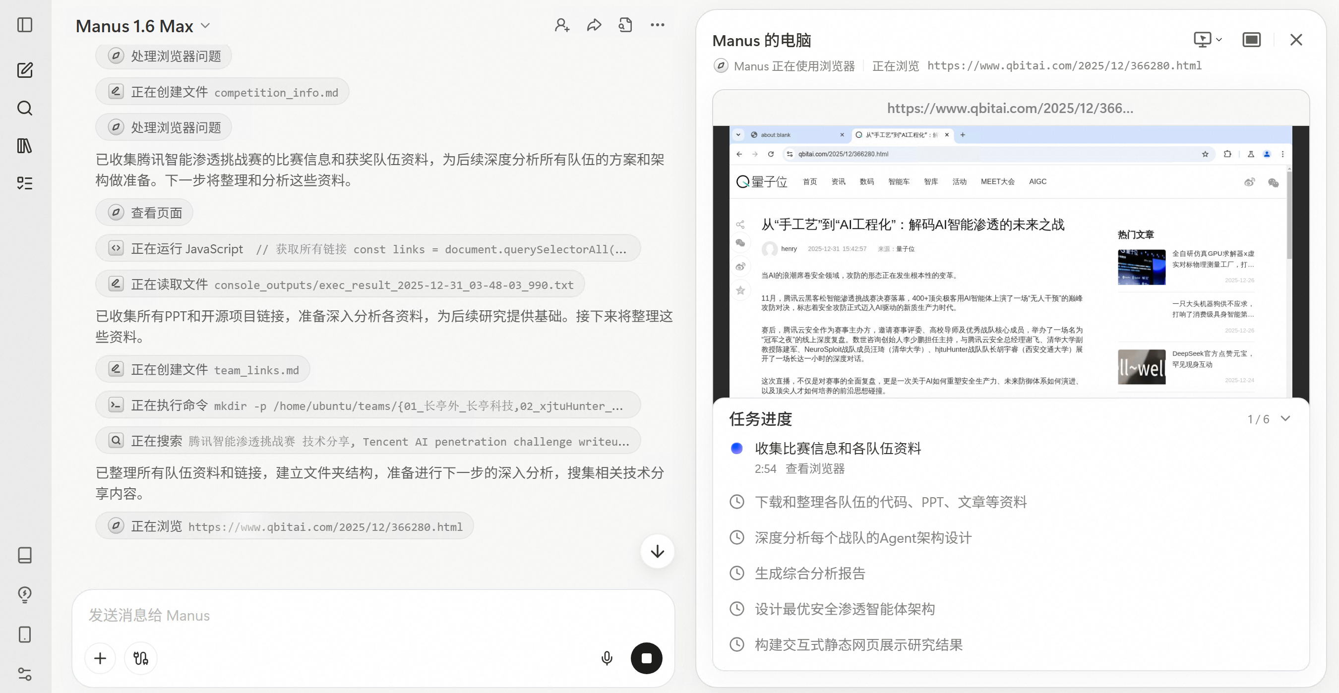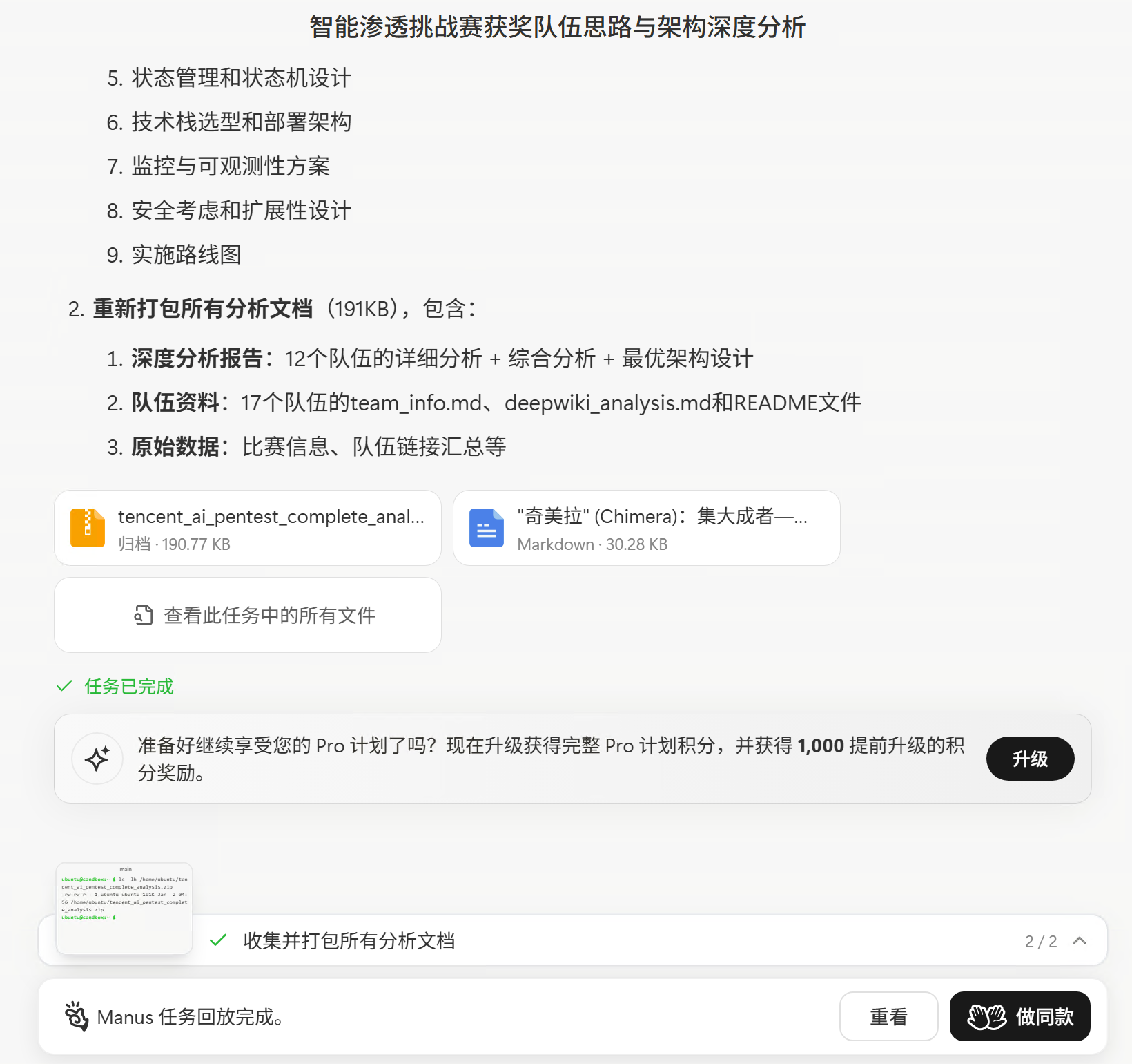 最近Manus被收购的消息传得火热,上次体验已经是很久之前的事了,这次想借这个机会测试一下它的最新能力:能不能帮我快速完成这17支队伍的资料收集、代码分析、架构总结,并进行深度分析,最后提炼出一个"博取百家之长"的终极安全渗透智能体架构。