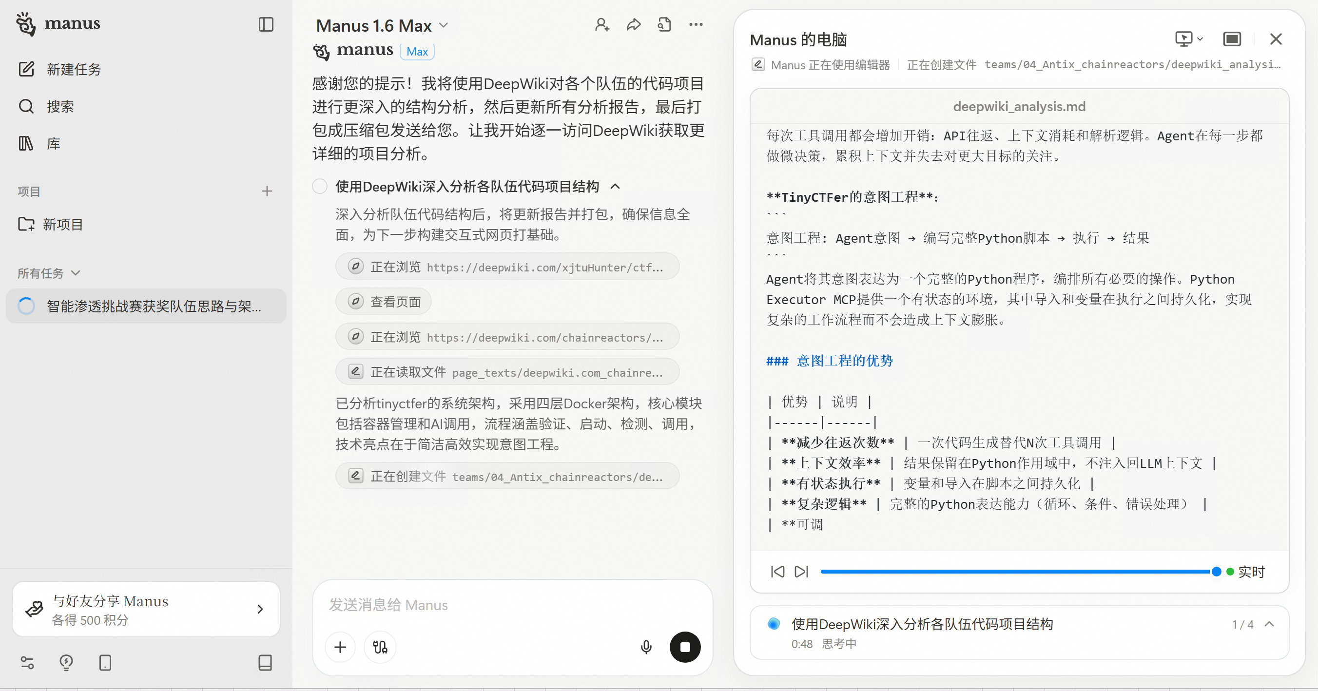 接收到这个提示后,Manus立刻调整了策略,开始更深入地分析各个队伍的代码架构,利用DeepWiki对各个GitHub仓库进行深度分析,生成了更详细的架构分析报告。