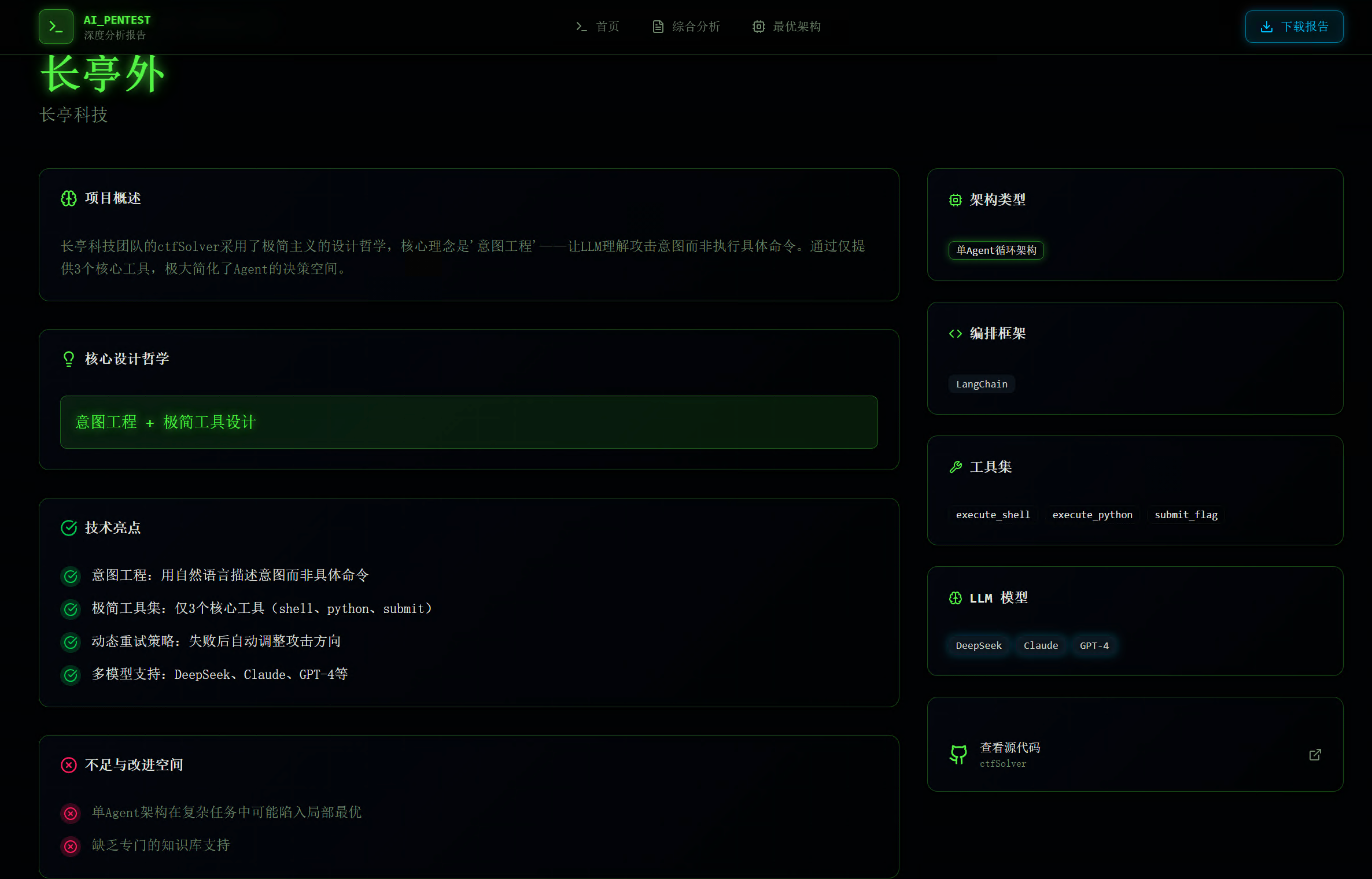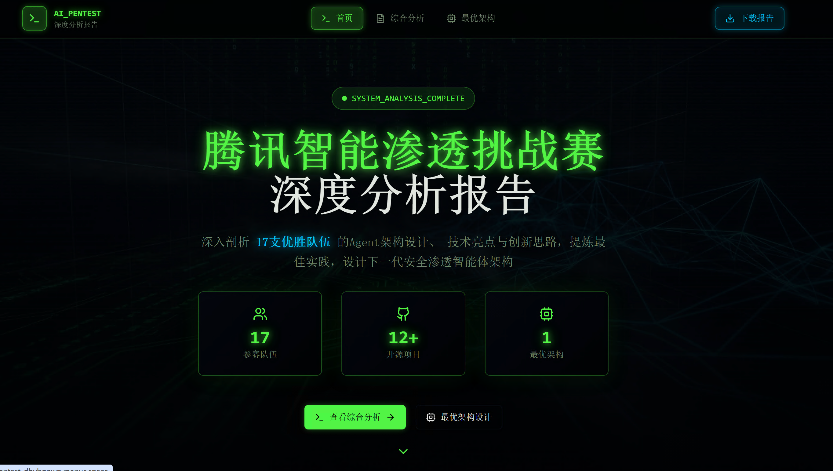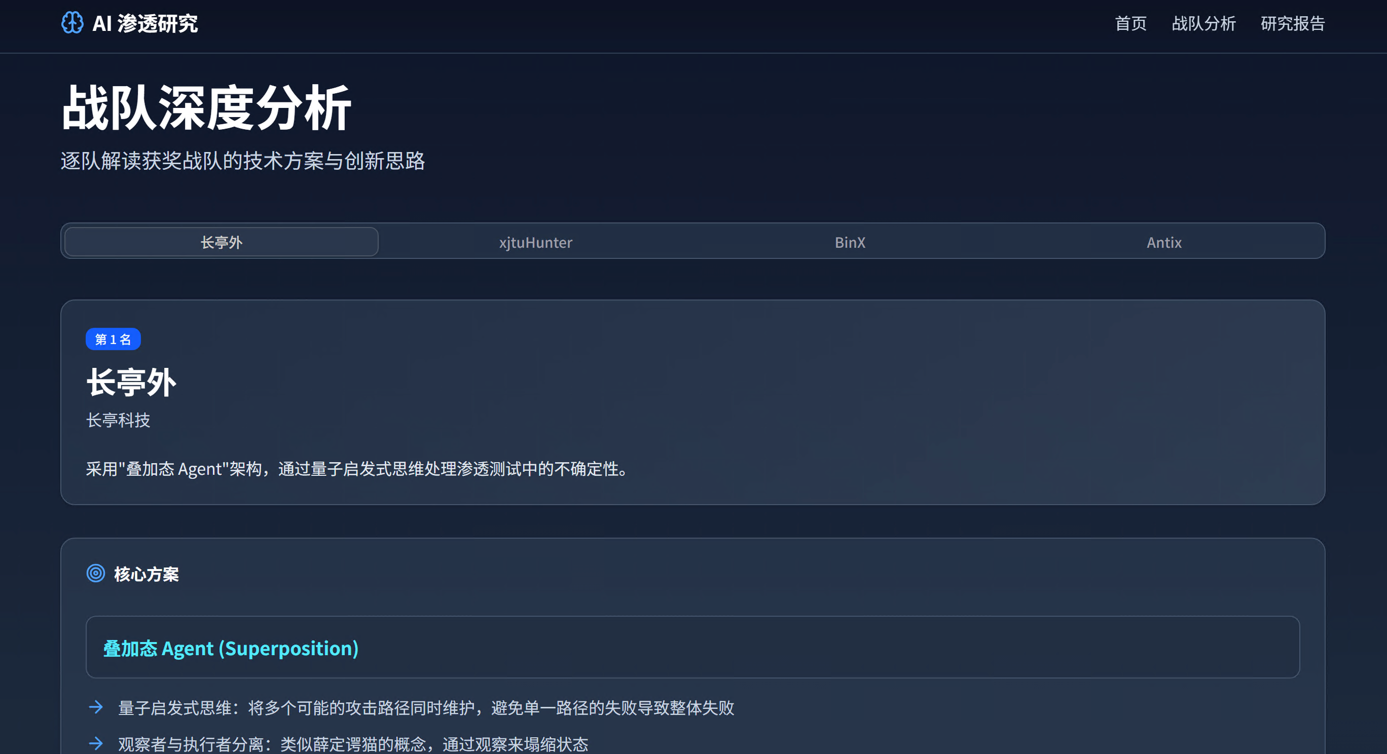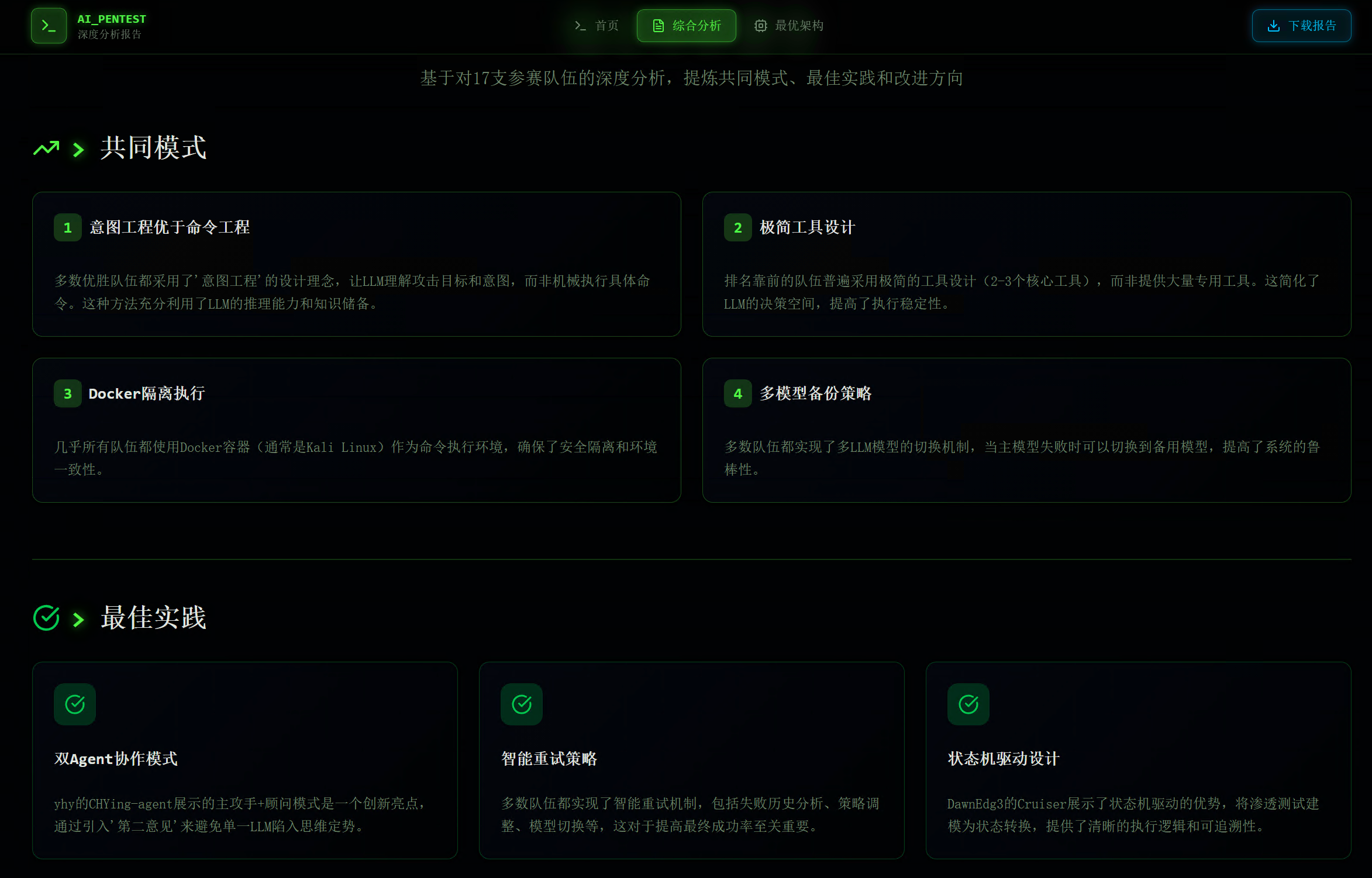 最终生成的网页设计得相当精美,采用深色科技感主题,首页展示了深度分析17支优胜队伍的Agent架构设计、技术亮点与创新思路,提炼最佳实践并设计下一代安全渗透智能体架构。