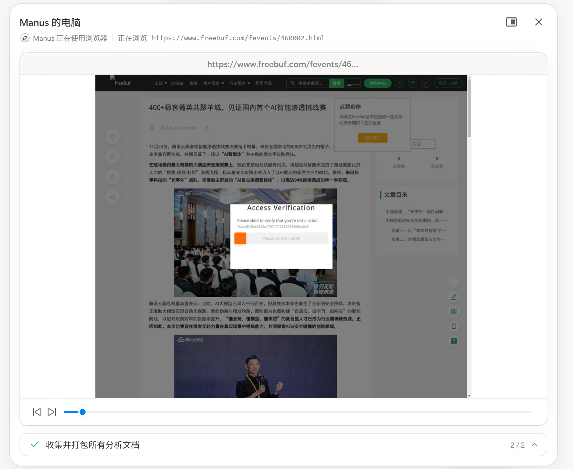 当然也遇到了一些问题。在访问某些网站时,Manus触发了风控验证,目前的版本还无法自动绕过这类验证码,只能跳过这些资源继续执行其他任务。