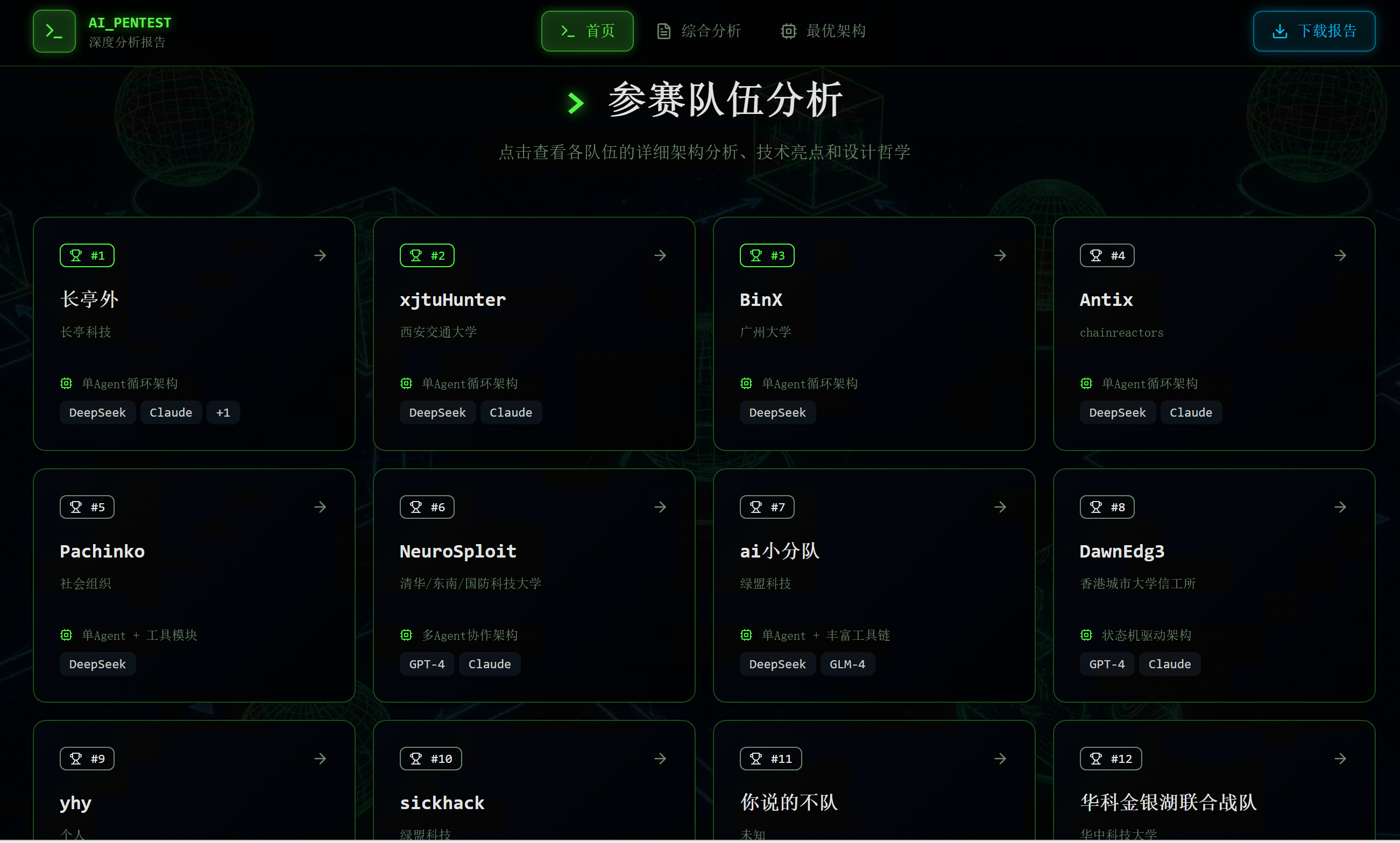 参赛队伍分析页面完整收录了12支开源队伍的详细信息,包括长亭外、xjtuHunter、BinX、Antix、Pachinko、NeuroSploit、ai小分队、DawnEdg3、yhy、sickhack、你说的不队、华科金银湖联合战队等,每个队伍都标注了使用的模型和架构类型。