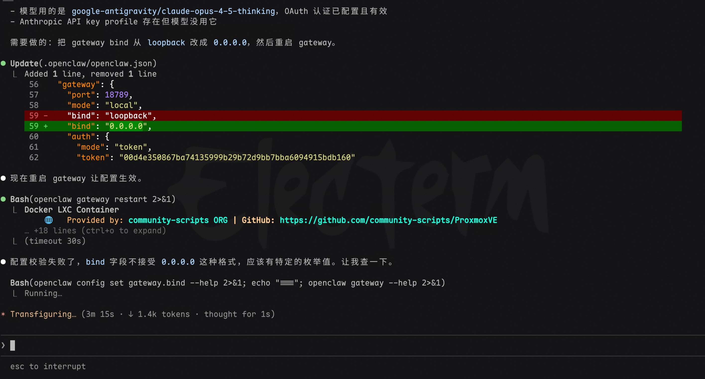 装好之后,因为要放在内网小主机上,需要改监听网段。默认绑定的是 loopback,局域网其他设备访问不了。继续让 Claude Code 帮忙修改。