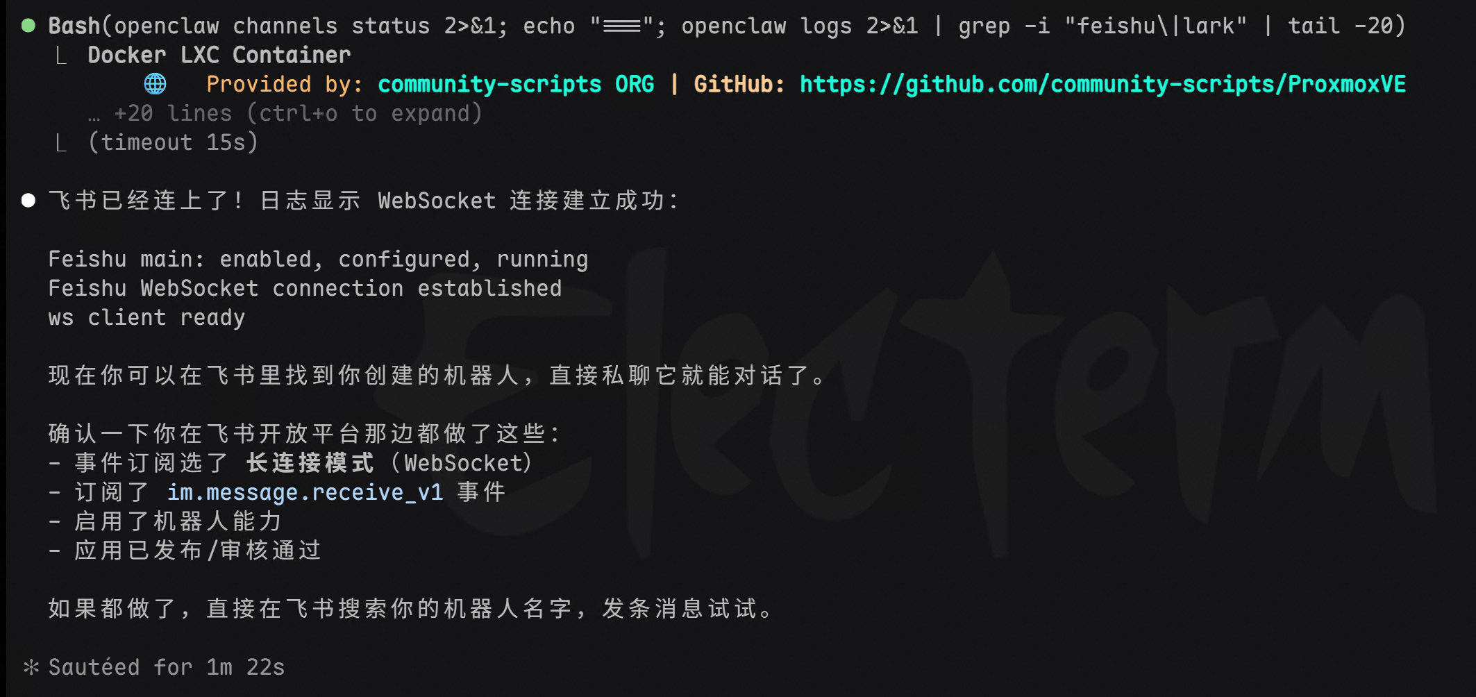 接着通过申请飞书的 bot 机器人,打通了对话通道。日志显示 WebSocket 连接建立成功,飞书 channel 已经跑起来了。