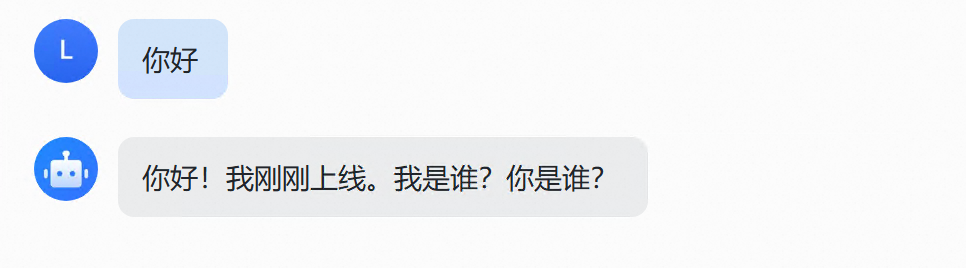 机器人回复:“你好!我刚刚上线。我是谁?你是谁?”