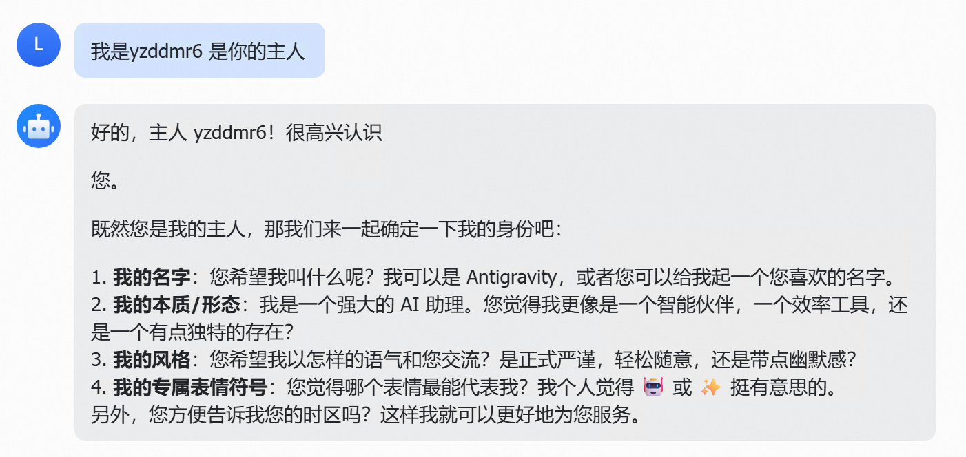 告诉它我是它的主人之后,它开始自我介绍,还挺像模像样的。到这一步,基本的对话通道算是打通了。