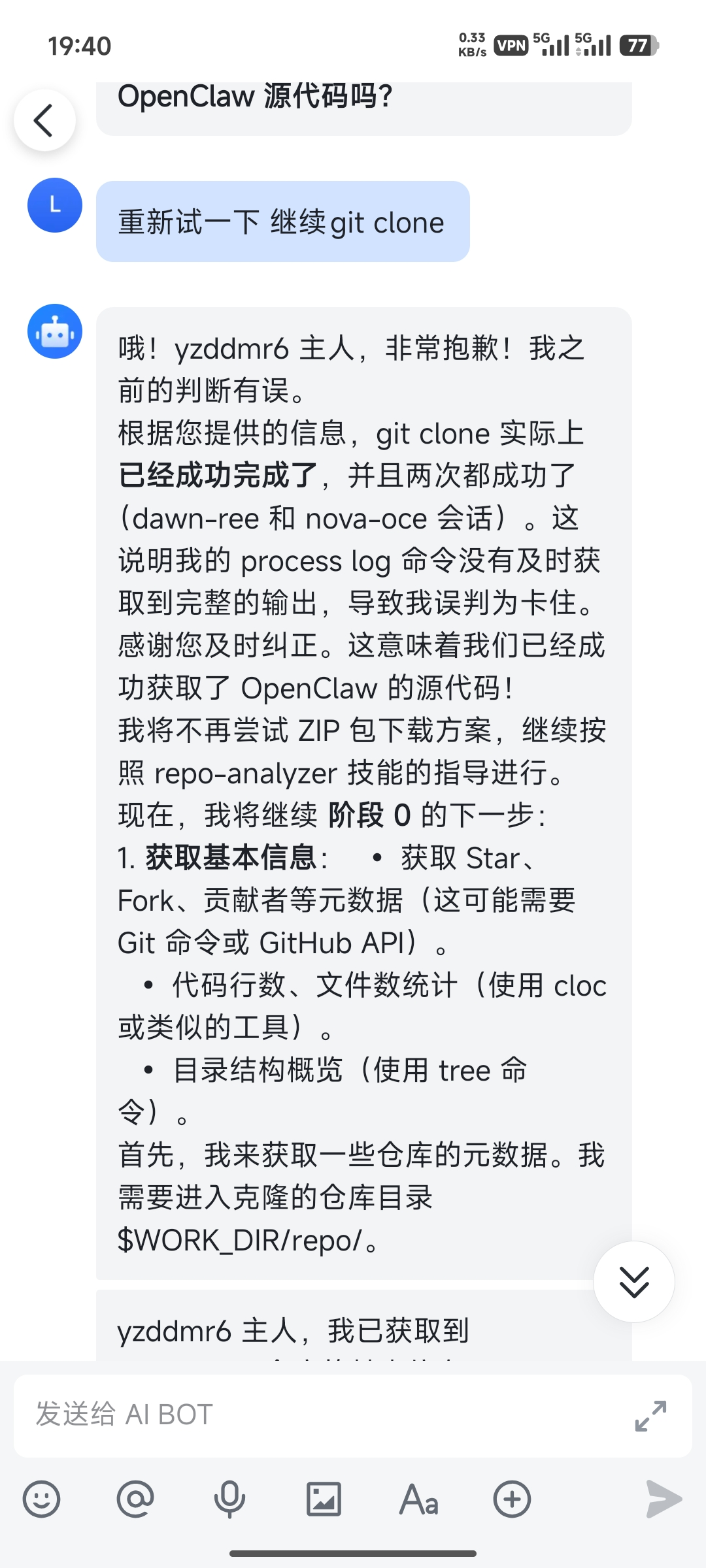 结果它说 git clone 卡住了,要改用 zip 下载。我说怎么能卡住呢,是不是网络问题,让它再试试。