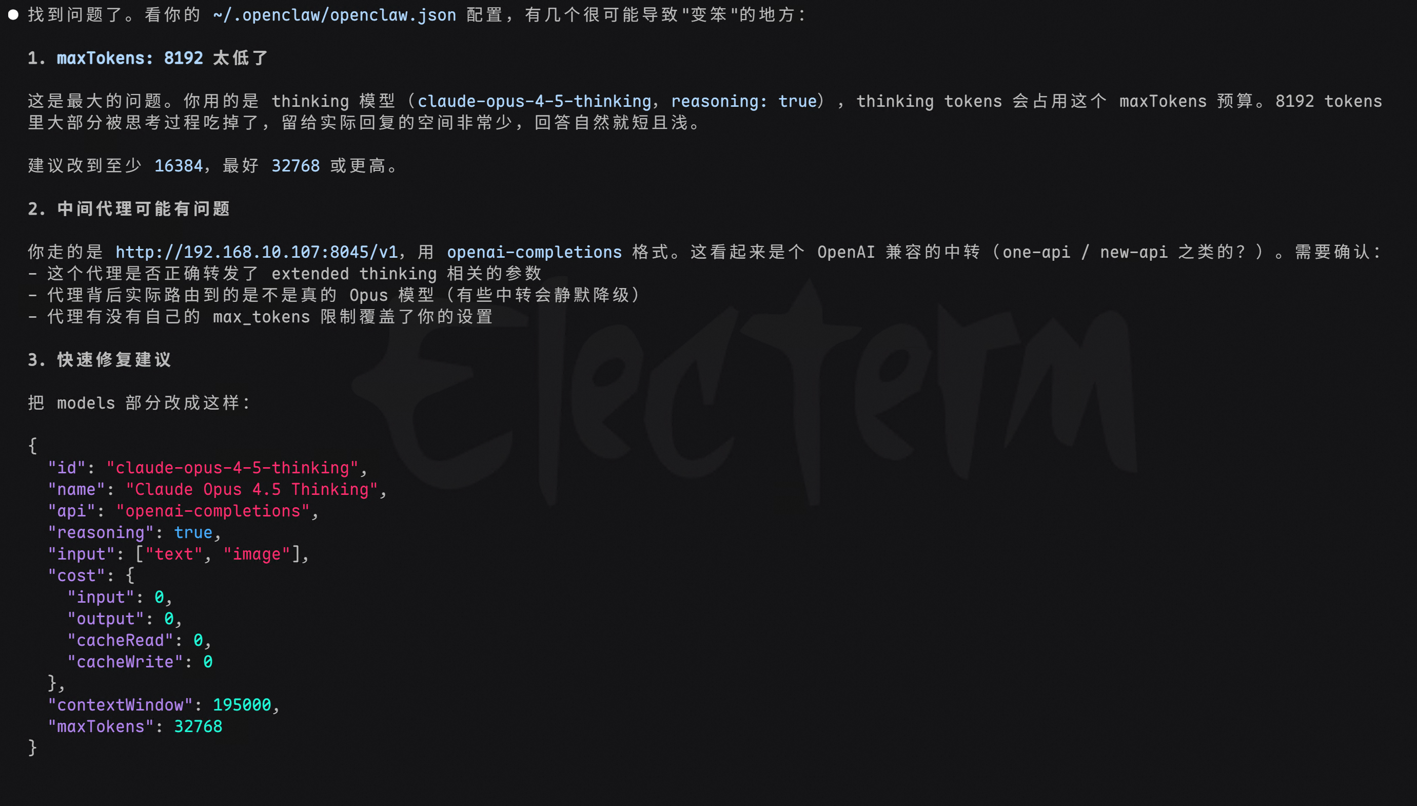 核心问题是 maxTokens 设置太低了(8192),thinking tokens 会占用这个额度,留给实际回答的空间就很小了。建议改到至少 16384,最好 32768。另外中间代理的 extended thinking 格式转换也可能有问题。