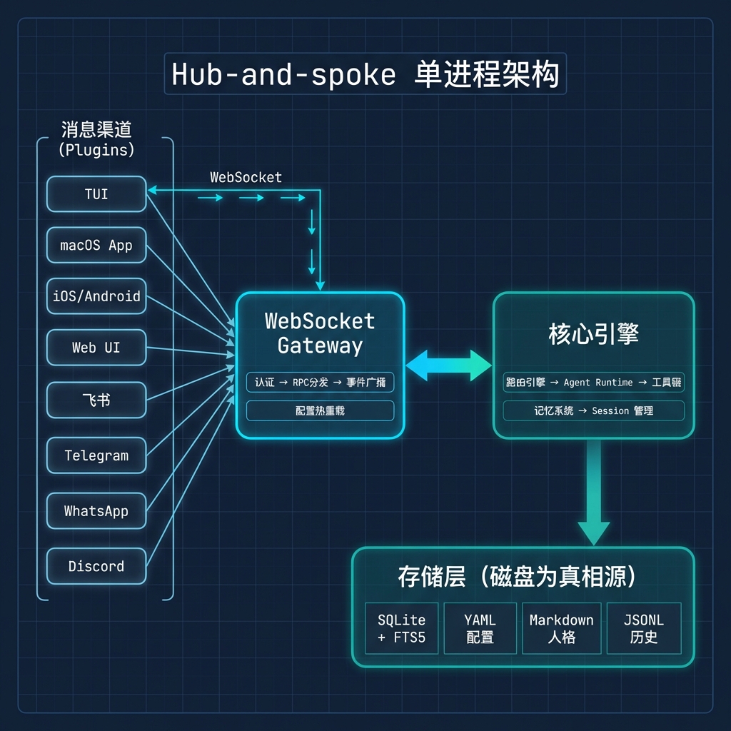 整个系统采用单进程 Hub-and-spoke 模式:WebSocket Gateway 是中心枢纽,所有客户端(TUI 终端、macOS App、Web UI、各种 IM 渠道)通过它与 Agent Runtime 通信。