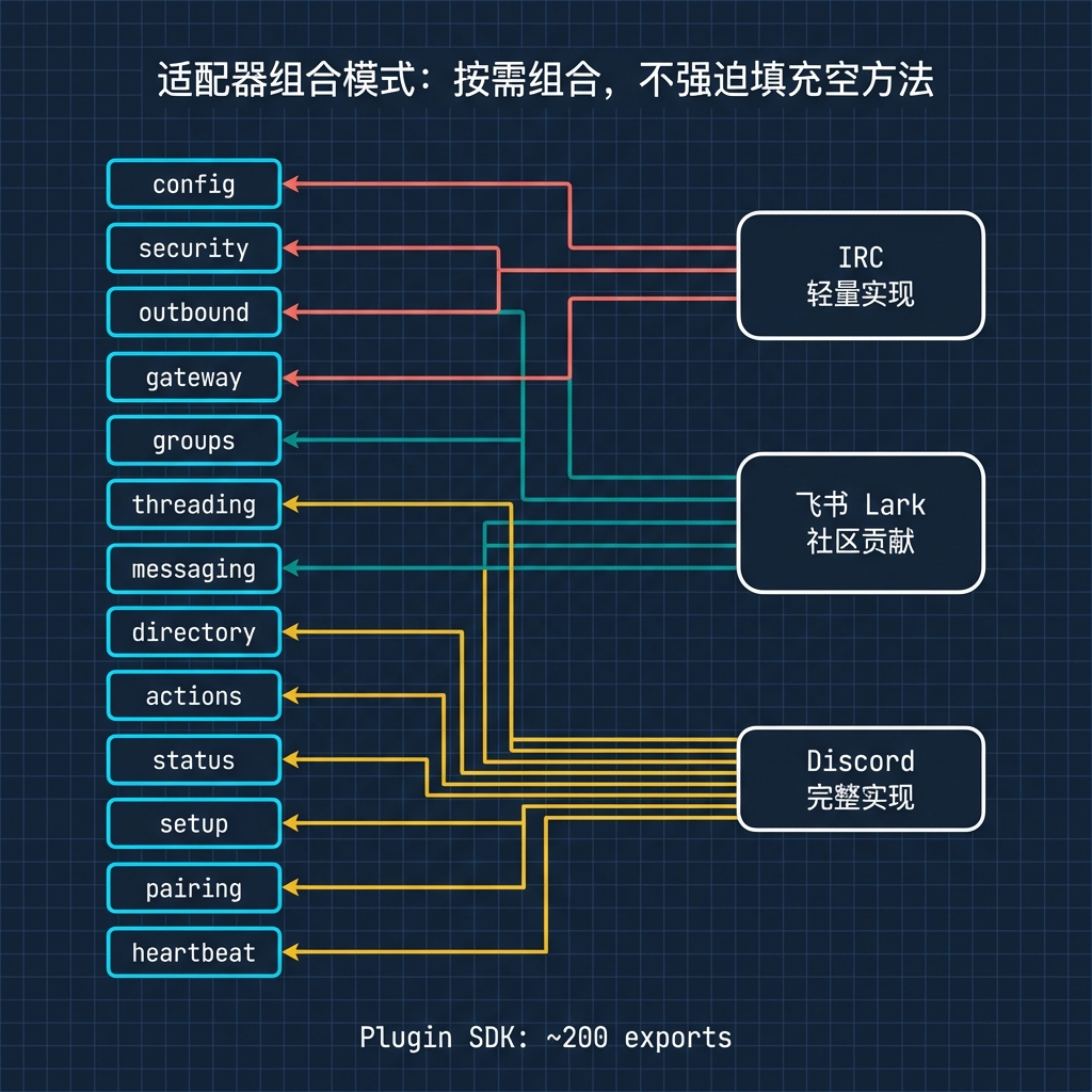 简单的 channel(如 IRC)只需实现少数几个适配器,复杂的 channel(如 Discord 需要 guild 权限审计、slash command、thread 支持)可以实现全部。系统不强迫简单实现填充空方法。从代码看,IRC 和 iMessage 的实现明显比 Discord 和 Telegram 轻量得多。