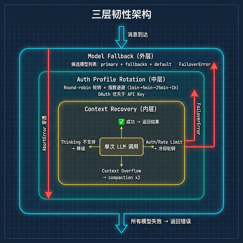 Agent Runtime 是系统的"大脑",它在容错上下了不少功夫。分析报告里把它总结为三层韧性架构,我觉得这个概括很准确。