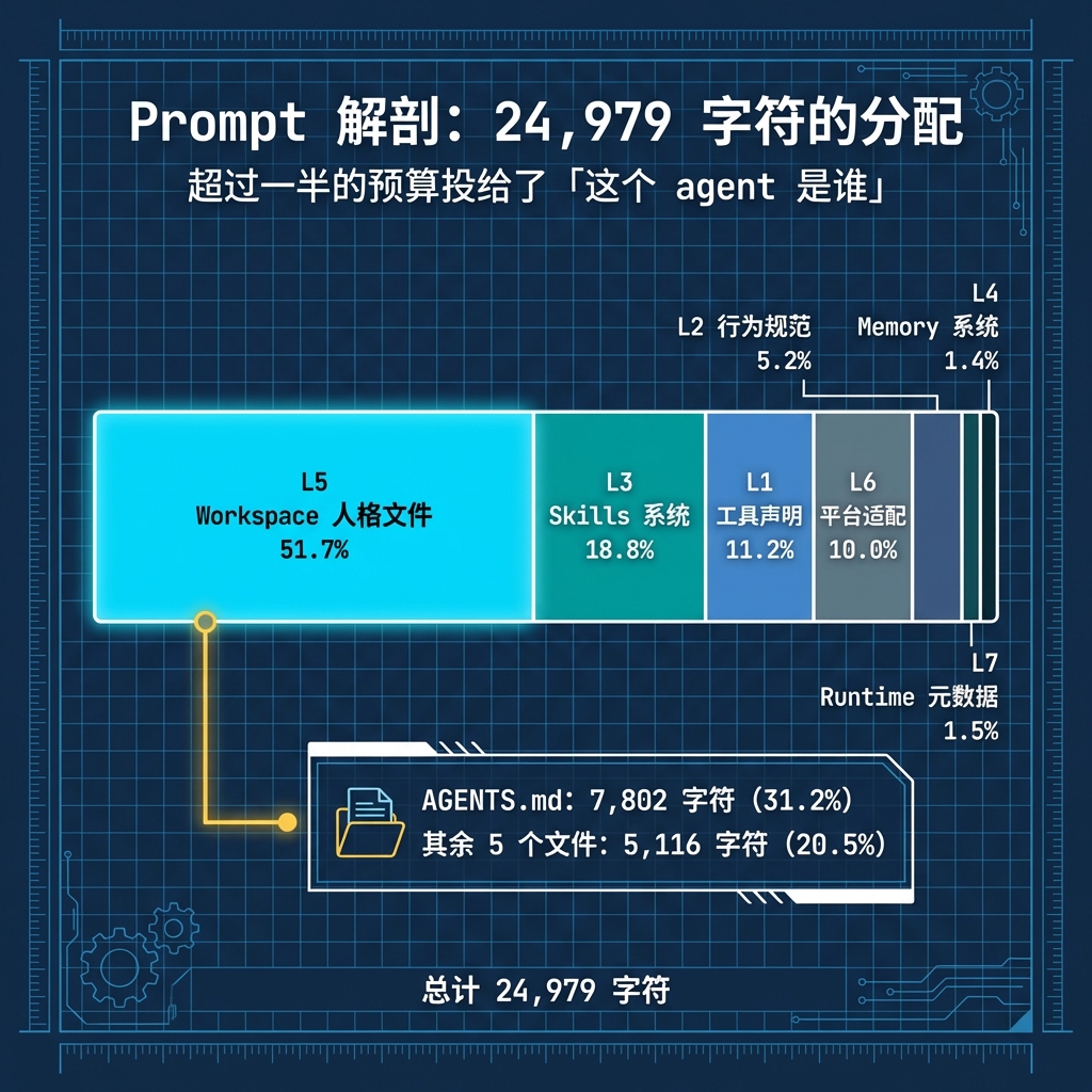 整体看下来,超过一半的 prompt 预算投给了"这个 agent 是谁",而不是"这个 agent 能做什么"。在 OpenClaw 的设计哲学里,人格一致性比功能声明更重要。